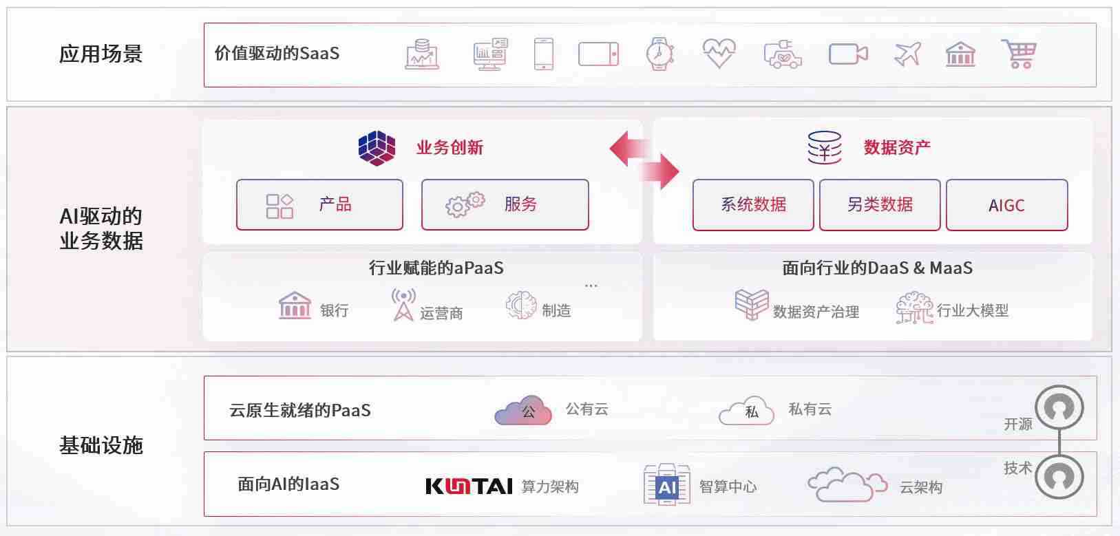 数字时代,,,围绕企业数字化转型的关键要素,,,AG尊龙凯时数码开创性的提出数云融合战略和技术体系框架,,着力在云原生、、、、数字原生、、AI原生和信创产业上架构产品和服务能力,,,,为处在不同数字化转型阶段的快消零售、、汽车、、金融、、、、医疗、、政企、、、、教育、、、、运营商等行业客户提供泛在的敏捷IT能力和融合的数据驱动能力,,构建跨界融合创新的数字业务场景和新业务模式,,助力企业级客户建立面向未来的核心能力和竞争优势,,,,全面推动社会的数字化、、智能化转型升级。。。。