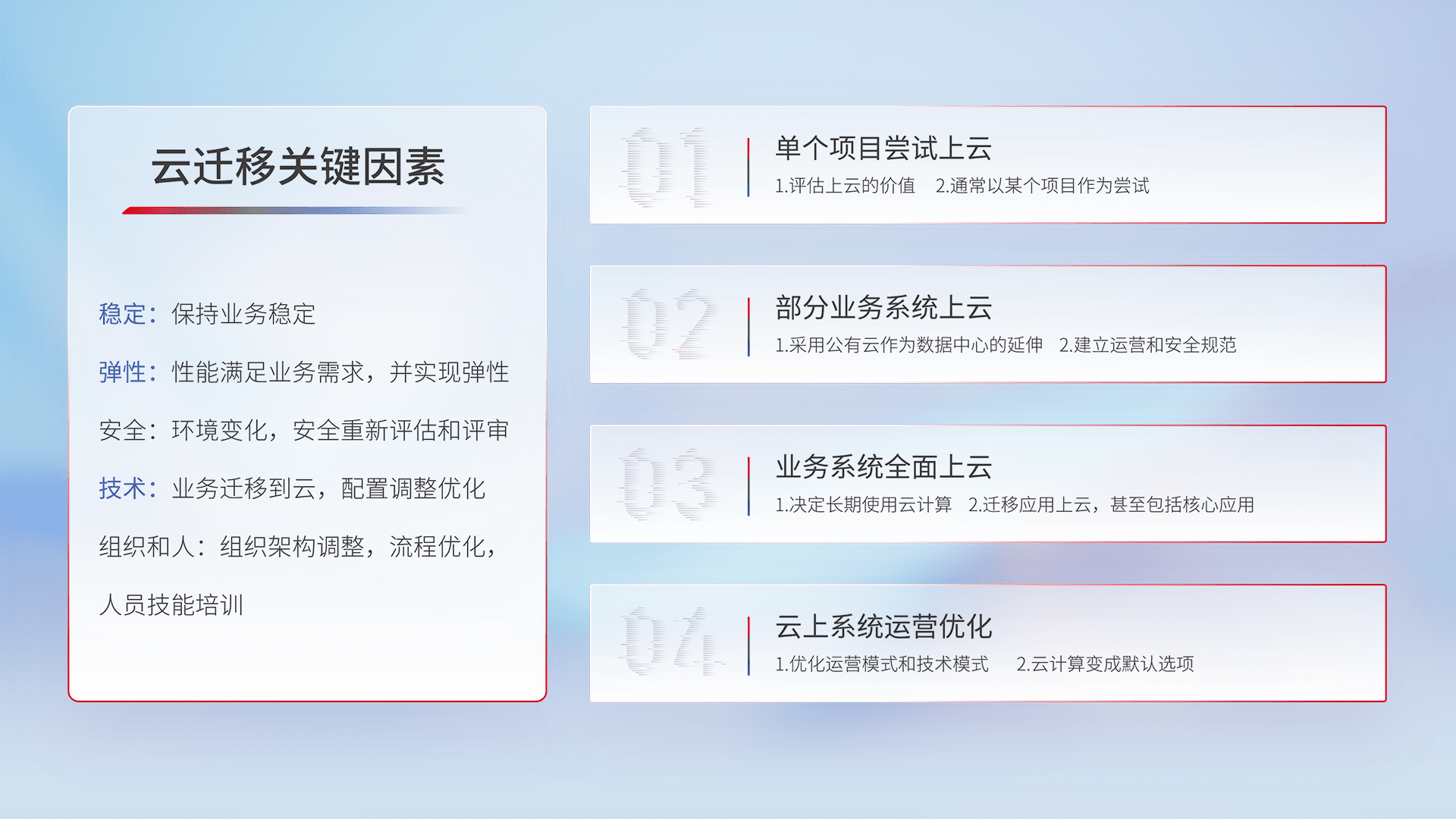 结合实际业务,,,,从规划设计、、、云平台选型、、、云原生改造、、、数据迁移、、、集成交付,,,,迁移全过程为客户识别最佳上云路径,,做好风险识别管理,,设计网络架构、、身份权限、、、安全审计合规、、操作审计、、、、日志审计、、、监控告警策略、、、多站点容灾设计等,,对云上基础设施进行整体规划,,,提升IT治理水平,,以满足弹性、、、、高可用、、、高性能的需求。。。。