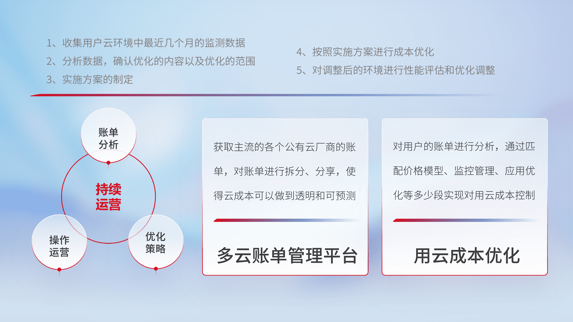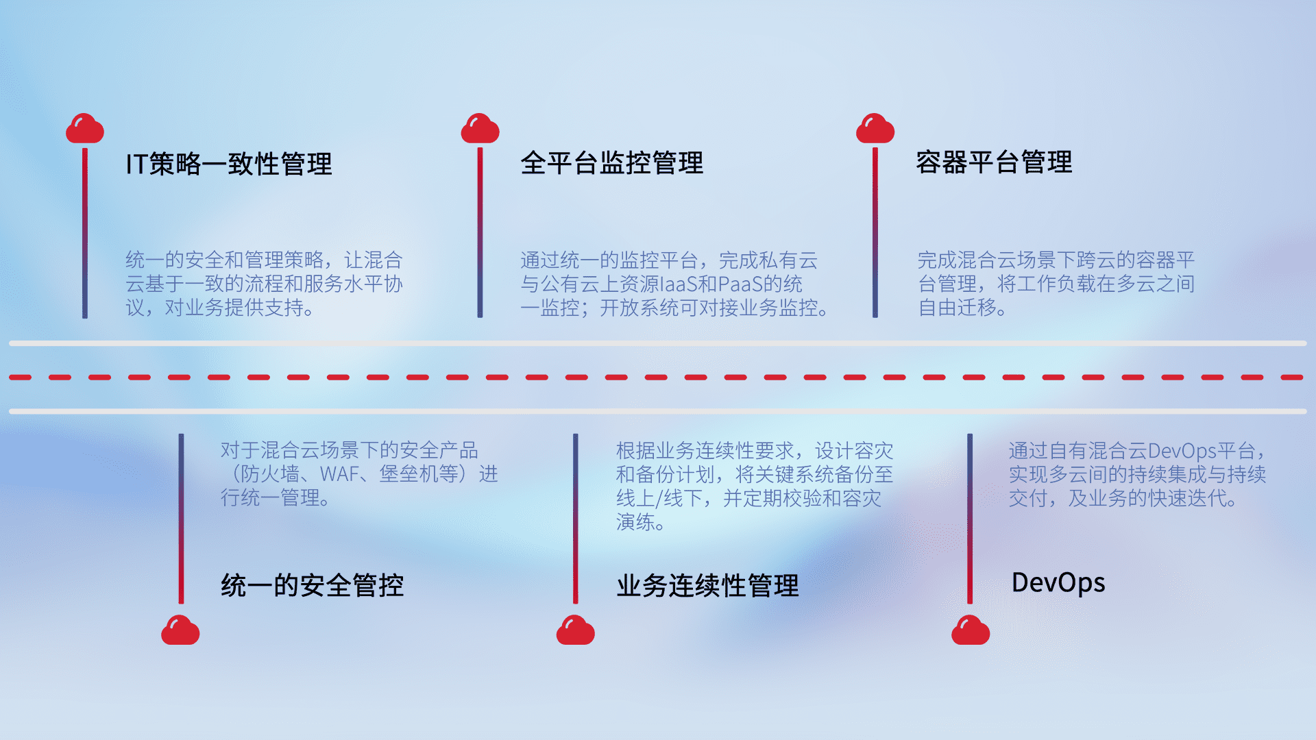 通过多云纳管,,以统一的资源数据模型把客户的云资源进行抽象和封装,,,进而实现对多云资源的统一操作,,,,保障云资源管理的可靠性、、稳定性与可用性。。。。量身定制化运维内容,,,配置、、开发运维、、、、补丁管理、、、备份、、、监控、、、认证和访问管理、、、审计和日常巡检等,,,,保障在用云过程中的可靠度,,,稳定度以及高可用率。。